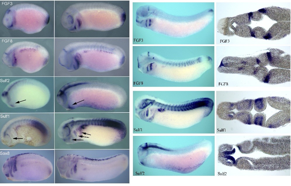 Frontal vibratome sections show XtSulf-1 expression in the pharyngeal mesoderm of the anterior and posterior branchial, hyoid and mandibular arches, XtSulf-2 expression in the pharyngeal endoderm of the mandibular arch and anterior ectodermal cleft of the hyoid arch, FGF3 and FGF8 expression in the anterior endodermal pharyngeal pouch of the posterior and anterior branchial, hyoid and mandibular arches.