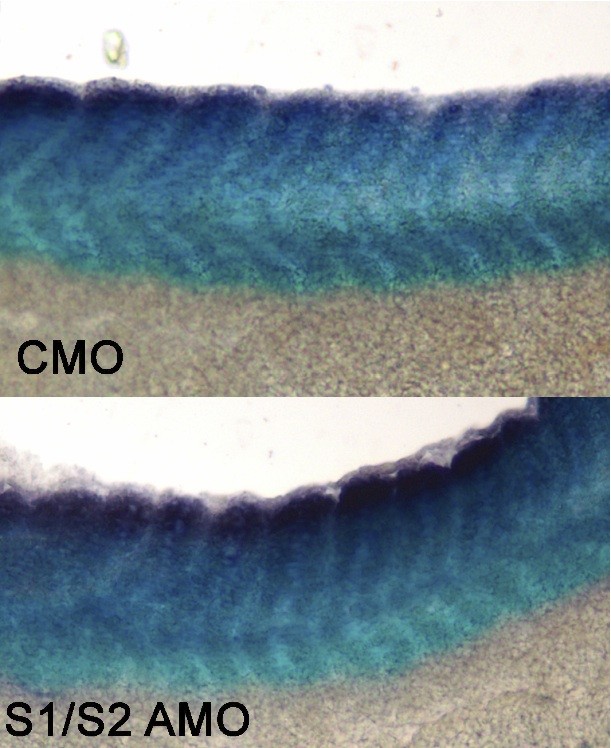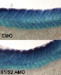 Supplementary Figure 6. The structure of somites is normal in Sulf1/2 knock-down embryos. Embryos were injected at the 8-cell stage with 30ng of control morpholino oligo (CMO, top panel), or with 20ng of antisense morpholino oligs directed against XtSulf2 together with 10ng of antisense morpholino oligs directed against XtSulf1 (S1/S2 AMO, bottom panel). At stage 30, the expression of a-cardiac actin was analysed by in situ hybridisation and subsequently sagital sections were taken with a vibratome. Anterior is to the left. Normal somite structure is evident.