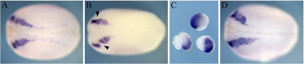 Supplementary Figure 7: CNC explants. In-situ hybridisation using the CNC marker Slug. (A) Dorsal view of a control NF stage 18 X. laevis embryo in-situ hybridised with Slug (B) Dorsal view of an NF stage 18 X. laevis embryo from which CNC explants were dissected in-situ hybridised with Slug. The black arrowheads indicate the regions were the CNC has been removed. (C) CNC explants were fixed immediately after dissection and processed for in-situ hybridisation with Slug. (D) Dorsal view of a control NF stage 18 X. laevis embryo injected with 3ng of XtSulf-2 mRNA and in-situ hybridised with Slug.