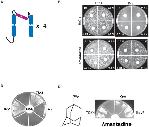 Figure 1. Blockers affect Kcv-dependent rescue of potassium transport deficient yeast.A, Cartoon showing the Kcv topology. The two transmembrane segments (M1 and M2) and the pore-forming region (P) are indicated. Four monomers assemble to make a functional channel. B, Examples of the effects of blockers applied at the indicated concentrations to yeast grown on selective media containing 0.5 mM KCl. Yeast express the transporter TRK1 and Kcv, as indicated. TRK1 image for barium is identical to [9]. C, Barium-resistant rescue of growth by the mutant Kcv* on 0.5 mM KCl media in the presence of 10 mM BaCl2. D, Amantadine-resistant rescue of growth by the mutant Kcv* on 0.5 mM KCl media in the presence of 500 mM amantadine. Chemical structure of amantadine is shown (left).