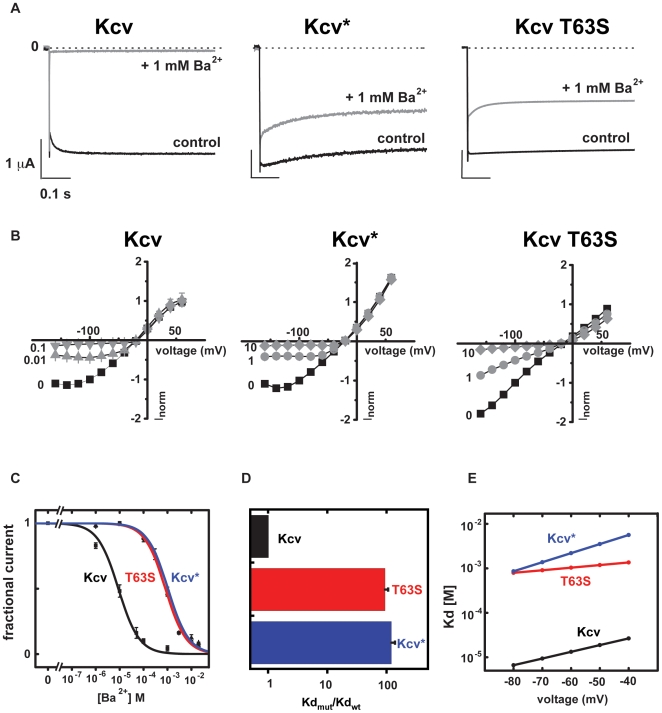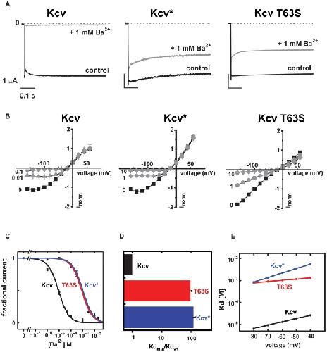 Figure 3. Functional characterization of Kcv mutants.A, Two electrode voltage clamp recording of Kcv, Kcv*, and Kcv T63S in 50 mM external KCl (control) and external KCl with 1 mM Ba2+. Test voltage is −60 mV from a holding potential of −20 mV. B, Current-voltage relations for Kcv, Kcv*, and Kcv T63S in the presence of different concentrations of external barium. Currents are normalized to the value at −100 mV for the barium-free solution. External barium concentrations (in mM) are indicated next to each I-V curve. C, Comparison of the relative barium affinities for Kcv (black), Kcv* (blue), and Kcv T63S (red) at −80 mV. Lines indicate fits to the Hill equation If = Kdn/(Kdn+[Ba2+]n). D, Comparison of the relative barium dissociation constants at −80 mV. E, Voltage dependence of steady-state barium block. Lines show fits to the Woodhull equation [63]. Kd(V) = Kd(0)exp(zFδ/RT x V), Kd(0) and δ values are: 0.09±0.48 mM, 28.0±0.9 mM, and 2.3±0.2 mM; δ = 0.33±0.04, 0.53±0.02 and 0.17±0.02 for Kcv, Kcv*, and T63S, respectively. Errors are s.d.