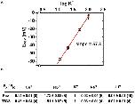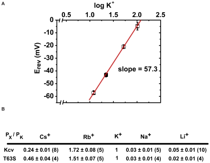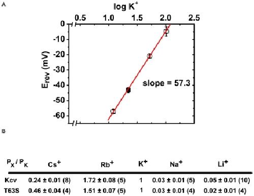 Figure 4. Selectivity to K+ and relative permeability to monovalent cations of Kcv and T63S.A, Potassium selectivity of Kcv and Kcv T63S channels. Mean values±s.e. (n = 3) for the current reversal potentials (Erev) of Kcv (○) and T63S (•)obtained in 10, 20, 50 and 100 mM external K+ are plotted as a function of log K+ concentration ([K+]out). Line represents the theoretical Nernst equation EK = RT/zF ln [K+]out/[K+]in with a slope of 59.2 mV, assuming that in oocytes [K+]in = 108.6 mM [64]. B, Permeability of wt Kcv and T63S mutant to different univalent cations. All cations were tested at 50 mM as chloride salts. PX/P K+ is the permeability of the ion X+ relative to K+, calculated from current reversal potentials (see Material and Methods). Values are the means±s.e.; number of tested oocytes is indicated in brackets. Values for wt Kcv are from [65].