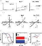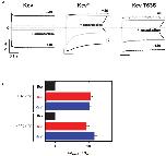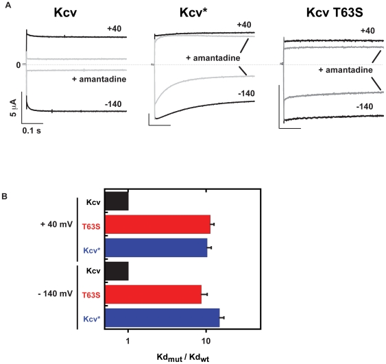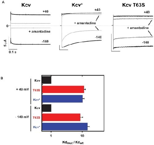 Figure 5. Functional characterization of amantadine sensitivity.A, Current traces at +40 mV and −140 mV in the absence (black) and presence (grey) of 10 mM amantadine for Kcv, Kcv*, and Kcv T63S. B, Comparison of the relative amantadine dissociation constants at +40 mV (2±0.2, wt; 22.4±1.4 Kcv*, 20.5±1.7 T63S) and −140 mV (0.8±0.1, wt; 6.9±0.9 Kcv*, 11.8±0.7 T63S). Errors are s.d.