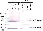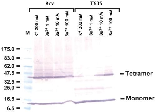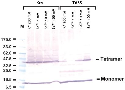 Figure 6. Stability analysis of Kcv and Kcv T63S.Western blot of microsomal membranes containing Kcv or Kcv T63S following treatment with the indicated concentrations of K+ or Ba2+ prior to loading onto an SDS gel. Positions of the tetramer and monomer forms, and the size of the molecular weight markers are indicated. Additional band in T63S is assigned as the dimer. Channels bear an N-terminal His9 tag and were detected using an anti-polyhistidine antibody (see Material and Methods).
