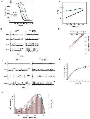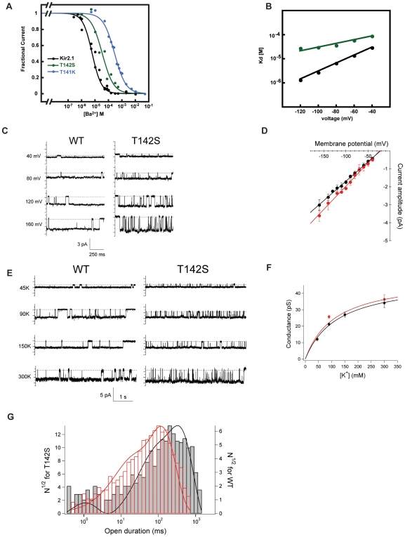 Figure 7. Kir2.1 T142S functional analysis.A, Comparison of the barium Kds for Kir2.1, Kir2.1 T142S (green), and Kir2.1 T141K (blue, data from [9]) B, Woodhull comparison for Kir2.1 and Kir2.1 T142S (green). Lines show fits to the Woodhull equation [63]. Kd(V) = Kd(0)exp(zFδ/RT x V). Kd(0) values are: 131±3 µM and 172±22 µM; δ = 0.56±0.02 and 0.22±0.02 for Kir2.1 and Kir2.1 T142S, respectively. C, Representative current traces of Kir2.1 and Kir2.1 T142S in 90 mM KCl. D, Plot of single channel amplitudes versus membrane potential. E, Single channel current traces for Kir2.1 and Kir2.1 T142S as a function of potassium concentration. F, Single channel conductance as a function of [K+]. Fits are to the Michelis-Menten equation and yielded values of Km = 123 mM, 120 mM, and γmax = 48.5 pS and 51.3 pS for Kir2.1 and Kir2.1-T142S, respectively. G, Gating kinetics analysis of Kir2.1 (black) and Kir2.1-T142s (red). Mean open times Kir2.1 298.7±292.2 ms (n = 416) and Kir2.1-T142S 93.4±92.6 ms (n = 1890). Intraburst probability was not changed (0.84±0.041 n = 8, 0.88±0.042 n = 8, Kir2.1 and Kir2.1-T142S, respectively). Errors are s.d.