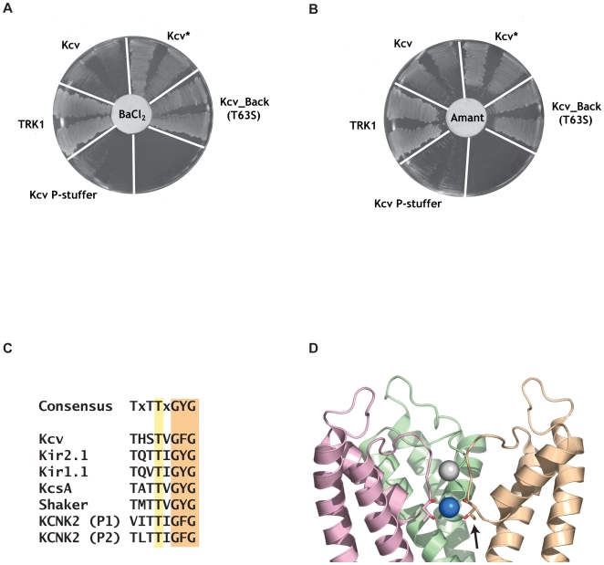Figure 2. Kcv Blocker-resistant mutants of potassium transport deficient yeast.Rescue in the presence of barium (10 mM BaCl2) A, and amantadine (500 mM) B, by the Kcv* and Kcv_Back mutant identified by backcrossing. Kcv_Back contains a single point mutation, T63S. Kcv P-Stuffer is a non-functional Kcv construct (see Materials and Methods). C, Sequence alignment of the selectivity filter regions of Kcv, Kir2.1, and select potassium channels. The positions of Kcv T63 and Kir2.1 T142 are highlighted in yellow. The selectivity filter ‘GYG’ sequence is also highlighted. D, Model indicating the position of the conserved T63 position (shown in sticks and having one of the copies indicated by the arrow) using KcsA [31]. The site 4 ion, which is coordinated by both backbone and sidechain oxygens from the T63 position is shown as a blue sphere. The front subunit of the KcsA tetramer is not shown.