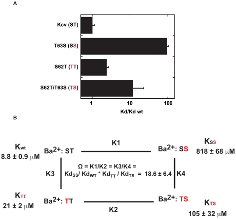 Figure 8. Coupling between Kcv residues 62 and 63 influences barium block.A, Comparison of the relative barium dissociation constants at −80 mV for Kcv, T63S, S62T, and S62T/T63S mutants. Brackets show the two positions under investigation. Red indicates the sites of the mutation. B, Double mutant cycle analysis [42], [43] shows that the changes at positions 62 and 63 are coupled. Ω = 1 for mutations that are energetically independent. Errors are s.d.