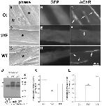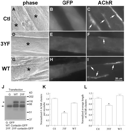 Figure 5. Inhibition of agrin-induced AChR clustering by forced expression of phospho-mutant cortactin in myotubes.To examine the effect of exogenous cortactin proteins on AChR clustering, C2 myotubes were transfected with mRNAs encoding GFP (Ctl) or GFP-tagged phospho-mutant (3YF) cortactin or wild-type (WT) cortactin. After treating myotubes with agrin overnight, cells expressing exogenous proteins (A, D, G; asterisks) were identified by green fluorescence (B, E, H) and the AChR clusters present on the surface of these cells were examined by R-BTX-labeling (C, F, I; arrows). Forced expression of the phospho-mutant, but not wild-type, cortactin reduced the number and lengths of agrin-induced AChR clusters in myotubes. J. To biochemically confirm the expression of exogenous cortactin proteins in myotubes, extracts prepared from myotubes transfected with mRNAs encoding GFP, GFP-tagged WT and 3YF cortactin were immuno-blotted with anti-cortactin monoclonal antibody mAb4F11. Myotubes transfected with GFP mRNA (G) contained full-length endogenous cortactin (arrow on left), but those transfected with WT- and 3YF-cortactin mRNAs contained endogenous cortactin plus a protein (∼25 kD larger) corresponding to exogenous, GFP-tagged cortactin (asterisk). MW marker positions are indicated on the right. K-L. Myotubes transfected with GFP or GFP-tagged cortactin proteins were selected randomly and the numbers and lengths of the AChR clusters present on their surface were determined; data from five separate transfection experiments were pooled and normalized relative to values obtained from GFP-tranfected cells. Fewer (K) and smaller (L) AChR clusters were present in myotubes expressing phospho-mutant cortactin than in cells expressing GFP alone or WT-cortactin-GFP. Mean and SEM values are shown, *P<0.05.