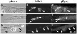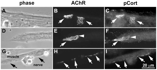 Figure 2. Tyrosine phosphorylation of cortactin at pre-patterned and nerve-induced AChR clusters.Xenopus muscle cells were labeled with R-BTX and after fixation with an antibody that specifically recognizes Y482-phospho-cortactin (plus FITC-linked anti-rabbit antibodies) (A-F). In some cases muscle cells were first co-cultured for 1 d with spinal neurons and then labeled with R-BTX and anti-phospho-cortactin and secondary antibodies (G-I). In pure muscle cultures (A, D) large “pre-patterned” AChR clusters were present (B, E; arrows) and at these sites staining by anti-phospho-cortactin was significantly stronger than elsewhere in muscle cells (C, F; arrows). Labeling for phospho-cortactin was detected at almost all pre-patterned clusters examined (see Table S1), although within the clusters certain regions at times appeared to be more enriched in phospho-cortactin than others (as in F; arrow versus arrowhead). The anti-phospho-cortactin antibody also labeled muscle cell edges (C, F) where cortactin is known to be localized. In nerve-muscle co-cultures (G) AChRs were selectively concentrated at synaptic contacts (H; arrows) and these nerve-induced AChR clusters were also labeled by the anti-phospho-cortactin antibody (I; arrows).
