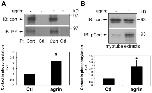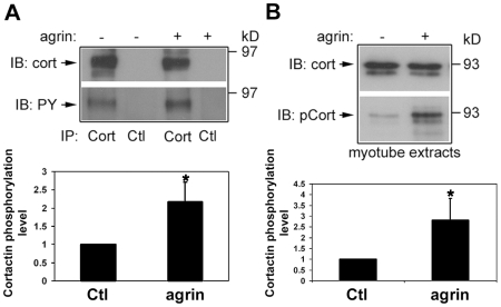 Figure 4. Agrin-dependent enhancement of cortactin tyrosine phosphorylation.Cultured C2 mouse myotubes were exposed to medium without (-) or with added agrin (+) before preparing extracts for immuno-precipitation (A) with a monoclonal antibody against cortactin (IP: cort) or an unrelated protein (IP: ctl). When these samples were immuno-blotted for cortactin (IB: cort) and total phosphotyrosine (IB: PY; mAb4G10), cortactin was found to be captured only by the anti-cortactin antibody (upper lanes), and anti-phosphotyrosine staining showed that cortactin from extracts of agrin-treated cells was tyrosine phosphorylated significantly more than that captured from control extracts (lower lanes). This increase in cortactin phosphorylation was quantified from four experiments (A, graph) by measuring band densities, normalizing for cortactin loading (see Methods), and calculating the phosphotyrosine level change relative to control. B. To test whether the src-target sites in cortactin were phosphorylated in response to agrin-treatment, myotube extracts were blotted with antibodies against total cortactin and cortactin phosphorylated on Y421. Agrin-treatment did not alter the amount of cortactin present in extracts (upper lanes) but the staining of cortactin by the anti-Y421-phospho-cortactin antibody (IB: pCort) was enhanced by agrin-treatment more than two-fold, as shown by quantification from three experiments (B, graph). Positions of pre-stained MW markers (Bio-Rad) are indicated on the right side of blots, and in the graphs * represents P<0.02 in t-tests.