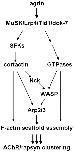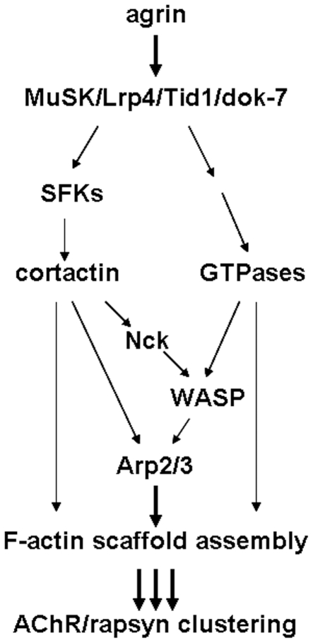 Figure 8. Cortactin signaling in agrin-dependent AChR clustering: a model.Activation of MuSK by agrin induces AChR clustering in an actin polymerization-dependent manner. This model depicts a possible way in which cortactin signaling might promote the AChR clustering process. Initiation of intracellular signaling by the activated MuSK complex could enhance cortactin's tyrosine phosphorylation through src family tyrosine kinases (SFKs) (and possibly other kinases such as abl), and cortactin, in turn, could increase actin polymerization. Alternatively, cortactin might trigger actin polymerization by activating the Arp2/3 complex, either on its own or in concert with WASP-related proteins (N-WASP, WIP, etc.) to which it could be linked by the adapter Nck. In parallel, via other signaling intermediates, MuSK could stimulate Rho-family GTPases and, through them, F-actin assembly. Such enhanced and dynamic actin polymerization at synaptic sites could generate a scaffold which âtrapsâ AChRs through rapsyn.