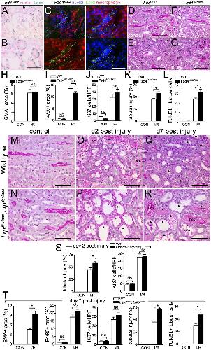 Fig. 3. Mutation of Frizzled4 or coreceptors Lrp5 and Lrp6 prevents normal repair and regeneration of the kidney following ischemia reperfusion injury. (A and B) Lacz staining in d5 post-IRI kidney showing restriction of Fzd4 expression to epithelial tubules and (C) low- (top left) and high-power views (split color panels) showing Fzd4 receptor expression is not present in F4/80+ macrophages in postinjury kidneys. (DâG) PAS-stained sections of normal (D and F) and d5 post-IRI kidneys (E and G) showing persistence of epithelial injury in mice lacking Fzd4 (Fzd4LacZ/LacZ). (HâL) Quantification of inflammation, injury, and repair parameters 5d post-kidney-IRI injury in Fzd4LacZ/LacZ or littermate control mice. (MâR) PAS-stained sections of kidneys. (S and T) Quantification of inflammation, injury, and repair parameters in WT or Lrp5+/lacz; Lrp6+/lacz kidneys. P < 0.05. n = 5 or 6/group. (Scale bars, 50 μm.) Asterisks, regenerating tubules; arrowheads, injured flattened epithelia; nec, necrotic debris.