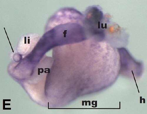FoxF1 ( forkhead box F2 ) gene expression in foregut dissected from Xenopus laevis tadpole, NF stage 43, as assayed by in situ hybridization. Lateral view: anteriorleft, dorsal up.
