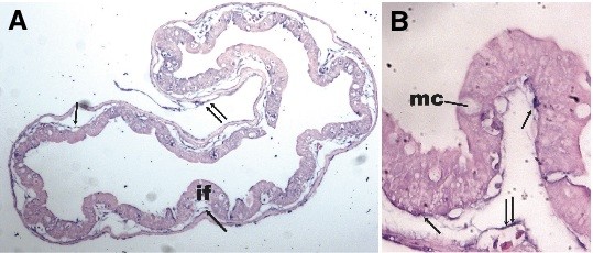 Fig. 3. Expression of XFoxF2 in the froglet intestine. (A) 10x view of a transverse section through the distalintestine of a froglet, immediately post-metamorphosis. The nascent intestinal folds are visible (if). The mesenchymal component of the gut is still underdeveloped. Arrows indicate staining in mesenchymal cells adjacent to the basolateral aspect of the epithelium. Double arrow indicates serosal expression. (B) 40x magnification of a developing intestinal fold. The lumen is to the top. Early mucin expressing cells are visible (mc). Arrows indicate expression at the epithelial-mesenchymal interface. Double arrow indicates expression in early blood vessel (blood cells in lumen).
