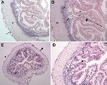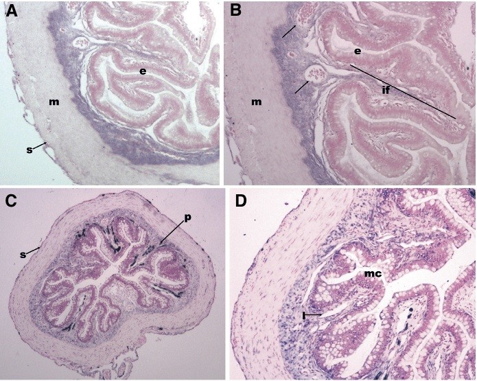 Fig. 4. Expression of XFoxF2 in the adult frog intestine. (A) Proximalintestine (4x magnification) showing FoxF2 expression in the subepithelial mesenchyme, between the epithelium (e) and the muscularis propria (m). There is light staining in the serosa (s). (B) 10x magnification of (A) highlighting expression in the mesenchyme of the intestinal fold (if) and surrounding mesenchymal vessels (arrow). The sections in (A,B) were counterstained using eosin. (C) 4x magnification of the distalintestine. The distalgutmesenchyme is less compact than proximally, but FoxF2 expression is also confined to the mesenchyme. The dark staining in the intestinal folds is pigment (p). Faint serosal expression is also noted (s). (D) 10X magnification of (C) highlighting expression in the mesenchymal stalk of the intesti- nal folds. The distalintestine is characterized by abundant mucin-producing cells (mc). The empty lumina are either vascular or lymphatic (l). Nuclear Fast Red was used for counterstaining of the distalintestine, highlighting the mesenchymal nuclei (C, D). Pigment is visible in the intestinal folds and trough; these cells are accepted to be melano- phores derived from the neural crest (Nieuwkoop, 1994).