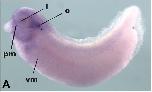 Fig. 2. Embryonic expression of FoxF2. Anterior is to the left and dorsal is to the top. (A) Expression in a tailbudembryo (stage 30). Expression is visible in the otic vesicle (o) and in the periorbital mesenchyme (pm) surrounding the eye, the lens (l) and branchial arches (ba). There is faint expression in the presumptive visceral mesoderm (vm). (B) Section through an embryo a few hours older (stage 35). Expression is noted in the headmesenchyme (hm) surrounding the otic vesicle (o) and the somites (s). Expression is visible in the cranial visceral mesoderm (vm), surrounding the early pharyngeal endoderm (en), (h): heart, (n): noto- chord. (C) Cross-section through the same embryo, more anterior, highlighting expression in the periorbital mesenchyme (pm), (mes): mesencephalon. (D) In the stage 39 embryo, expression is visible in the branchial arches (ba) and the presumptive visceral mesoderm (vm). The presumptive liver (li) does not express FoxF2. The presumptive gallblad- der is highlighted by the circular expression at the anteriorventral expression boundary (arrow). (E) Expression of FoxF2 in the isolated gut of a stage 43 embryo. There is strong expression in the lung (lu) and proximalforegut (f). The gallbladder (arrow) expression is visible, in contrast to the liver (li) and pancreas (pa) which do not express XFoxF2 at this stage. Expression in the midgut (mg) and hindgut (h) is character- ized by a fine, reticular pattern.
