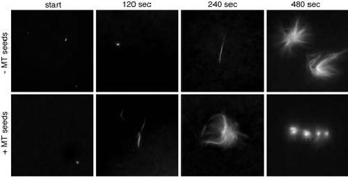Figure 2. Taxol stabilized MT seeds strongly promote MT production and aster assembly in meiotic Xenopus egg extract. The two time series shown here were prepared as in Figure 1A but with addition of soluble Taxol (top series) or Taxol stabilized MT seeds (bottom series). Without MT seeds, the first traces of MTs were visible after ∼240 sec and organized asters (of 10–30 µm diameter) were visible after ∼480 sec. With MT seeds, organized asters were visible already after ∼240 sec. Thus, MT seeds speed up MT production by ∼240 sec. This supports a model where MTs induce the production of more MTs and that this mechanism is responsible for the assembly of MT super-structures.