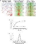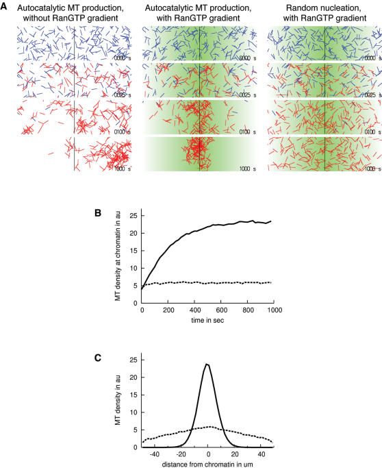 Figure 3. Autocatalytic MT production, dynamic instability, and a RanGTP gradient are necessary and sufficient to target MT production to the center of the gradient. A. MTs in a RanGTP gradient (green indicates high RanGTP concentration). Randomly positioned MTs (blue lines) disappear due to dynamic instability and new MTs are produced (red lines). Without coupling the MT production probability to the RanGTP gradient, MT patches form randomly (left panels). Without autocatalytic MT production, MTs distribute proportional to the RanGTP gradient and do not form patches (right panels). All three components can efficiently concentrate MTs in the center of the gradient (center panels). B. MT density at the centre of the gradient as a function of time with (black line) and without (dashed line) autocatalytic MT production. Without autocatalytic MT production, a constant low MT density is quickly reached, while autocatalytic MT production concentrates MTs in the center of the gradient. C. MT density after 1000 sec as a function of distance from the centre (lines as in B). Autocatalytic MT production efficiently localizes MTs to the center of the gradient.