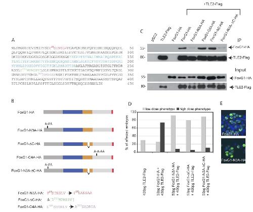 Fig. 6. Motifs in FoxG1 that are responsible for the binding and functional cooperativity of FoxG1 and TLE2. (A)ï Amino acid sequence of X. laevis FoxG1 and potential TLE binding motifs. The DNA-binding domain is shown in blue, the N-terminal eh1 motif is highlighted in red, the C- terminal WRPW-like motif in green and the cryptic eh1 motif in purple. (B)ï Schematic representation of the FoxG1 mutants. The N-terminal domain is shown in dark grey, the DNA-binding domain in blue, the potential TLE1 interaction domain in orange and the HA epitope in red. Beneath is shown the sequence of mutated motifs (same colour coding as in A). (C)ï Immunoprecipitation (IP) of HEK 293T cells transfected with FoxG1-HA or FoxG1 mutants together with TLE2-Flag, showing that mutation of the N-terminal eh1 motif (FoxG1-N3A-HA), either alone or simultaneously with the C-terminal motif (FoxG1-N3A-ïC-HA), leads to loss of binding to TLE2. The top two panels show IP with anti-Flag followed by western blotting with anti-HA and anti-Flag. Lower panels show the input (pre-IP lysates) analysed by western blotting with anti-Flag and anti-HA. (D)ï The phenotypes of embryos injected with the indicated amounts of X. tropicalis TLE2 and X. laevis FoxG1 or FoxG1 mutant mRNA were scored as low- dose or high-dose as in Fig. 5. TLE2 does not cooperate with any of the three mutants to convert a low-dose FoxG1 injection into a high-dose phenotype. (E)ï HEK 293T cells transfected with either FoxG1-HA or FoxG1-N3A-HA. Both proteins are nuclear.