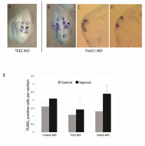 Fig S3. Fig. S3. Effect of TLE2 MO and FoxG1 MO on emx1 and TUNEL staining after unilateral injection of X. tropicalis embryos. (A-D) One cell of a two-cell stage embryo was injected with 7.5 ng MO plus lacZ mRNA; the injected side is indicated by light-blue X-Gal staining in st. 32 embryos. (A,B) Frontal views of injected embryos. (C,D) Parasagittal sections of the embryo shown in B, at the levels indicated. emx1 is normally mainly expressed in the dorsal telencephalon (pallium), but the striatum (lge) and olfactory bulb, which are located more ventrally, also contain scattered emx1-positive cells (Bachy et al., 2002), giving the appearance of a 'gap' between dorsal and ventral expression (black arrow in B). In FoxG1 MO-injected embryos this gap does not exist (red arrow in B, 83%, n=12), indicating an expansion of the dorsal expression domain. This is not observed in the TLE2 MO-injected embryos, although the overall emx1 expression domain is often slightly reduced (50%, n=14). Note that the ventral and dorsal parts of the telencephalon are ontogenetically rostral and posterior, respectively; Bachy et al. (Bachy et al., 2002) use the term rostral to describe the subpallium, whereas we use the term ventral for consistency with the zebrafish and mouse literature. (E) Quantification of cell death by TUNEL staining. TUNEL-positive cells were counted on the injected and uninjected sides across two consecutive forebrain sections in at least five embryos and averaged. P-values are as follows: FoxG1 MO, 0.168; TLE2 MO, 0.64; Control MO, 0.1869. P>0.1 and, therefore, not significant in all cases.