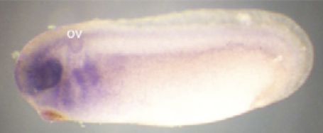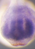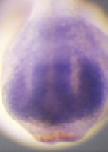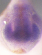 foxg1 (forkhead box G1) gene expression in Xenopus laevis embryo, assayed via in situ hybridization, NF stage 23, anterior view, dorsal up.