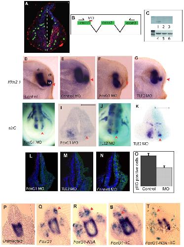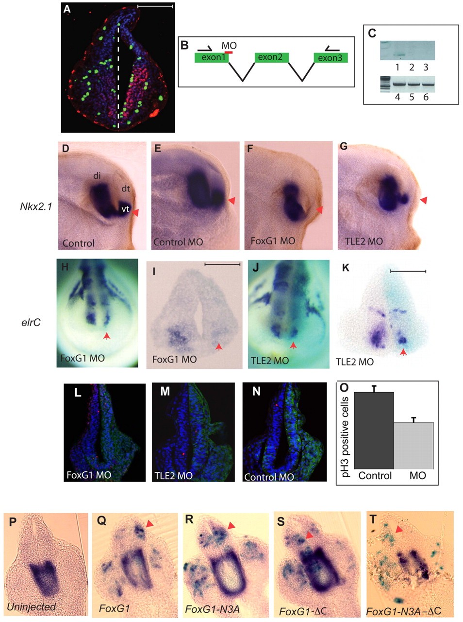Fig. 7. The effect of FoxG1 and TLE2 MO on forebrain development. (A)Transverse sections of forebrain of FoxG1 MO-injected (7.5 ng) embryos (st. 28) stained with DAPI (blue), anti-pH3 (green) and anti-FoxG1 (red). Note the reduction of FoxG1 staining and in pH3-positive cells on the MO-injected (left) side in the presumptive FoxG1 expression region. Dashed white line indicates the midline. (B)Schematic representation of the TLE2 splice MO (red) and location of PCR primers in relation to the exon-intron arrangement of TLE2. (C)Semi-quantitative PCR from embryos injected with 10 ng Control MO (lanes 1, 4), 10 ng TLE2 MO (lanes 2, 5) or 20 ng TLE2 MO (lanes 3, 6). Primers used were ornithine decarboxylase (ODC) as control (lanes 4-6) and TLE2 exon 1 and TLE2 exon 3 (lanes 1-3) (see B). (D-G)Nkx2.1 expression in the forebrain of st. 34 control embryos and embryos injected at the one-cell stage with 10 ng Control MO (E), 15 ng FoxG1 MO (F) and 15 ng TLE2 MO (G). The expression in the ventral telencephalon (red arrowhead) is reduced or missing in TLE2 and FoxG1 morphant embryos (F,G). di, diencephalon, dt, dorsal telencephalon, vt, ventral telencephalon. (H-N)Embryos injected in one cell at the two-cell stage with FoxG1 MO (7.5 ng) and TLE2 MO (7.5 ng) processed for in situ hybridisation for elrC (H-K) and TUNEL staining (red nuclei; L-N). Injected side is to the right, as marked by X-Gal staining (H-K) or FITC (L-N). (H,J)Frontal views; (I,K-N) transverse sections through the forebrain of st. 19 (H-K) or st. 32 (L-N) embryos. Reduced forebrain elrC expression on the MO-injected side is indicated by red arrows. There was no statistically significant increase in TUNEL staining. (O)In FoxG1 MO-injected forebrains there was a 40% decrease (P0.003, paired t-test, n12 embryos) in pH3-positive cells. (P-T)Transverse sections through the forebrain of FoxG1 MO-injected embryos, subsequently electroporated with wild-type FoxG1 and various FoxG1 mutated versions, as indicated, together with lacZ DNA and analysed for Nkx2.1 expression. Light blue (X-Gal staining) indicates cells that have taken up the electroporated DNA (red arrowheads indicate examples of electroporated cells); dark purple indicates cells expressing Nkx2.1. The experiment was repeated four times with similar results. See Materials and methods for details. Scale bars: 100m