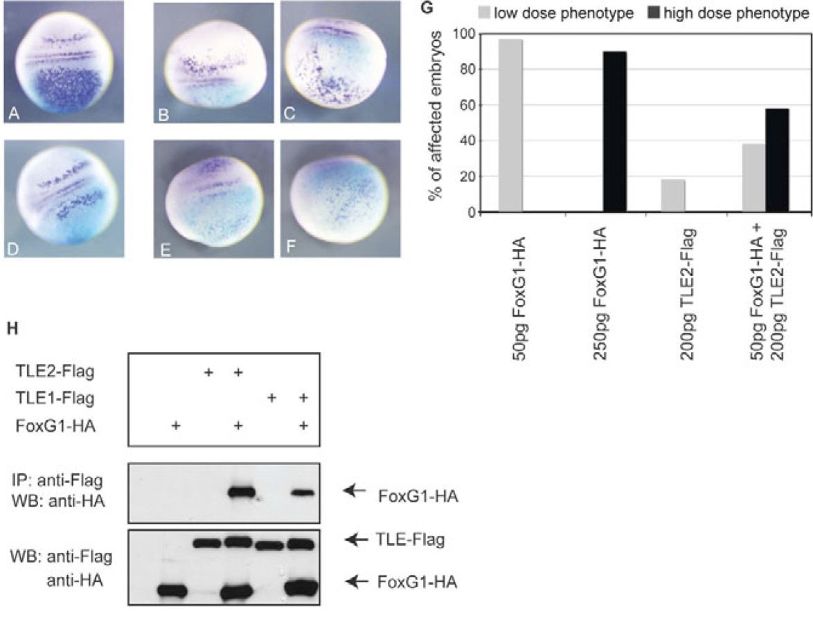 Fig. 5. FoxG1 interacts physically and cooperates functionally with TLE2. (A-F) X. laevis embryos were injected at the two-cell stage and processed for X-Gal staining (light blue) and whole-mount in situ hybridisation for N-tubulin (purple) at st. 16. Low-dose injection of X. laevis FoxG1 (50 pg) gives rise to ectopic neurogenesis throughout the lateral ectoderm (A), whereas high-dose injection (250 pg) causes a complete suppression of endogenous neurogenesis on the injected site and ectopic neuronogenesis outside the X-Gal staining area (B,C). Injection of X. tropicalis FoxG1 mRNA gave rise to similar phenotypes (not shown). Co-expression of 200 pg X. tropicalis TLE2 with 50 pg X. laevis FoxG1 (E,F) gives rise to a phenotype that is similar to high-dose injections (250 pg) of FoxG1 alone (B,C). TLE2 alone has no effect (D). (A,B,D,E) Dorsal views; (C,F) lateral views. In all panels, anterior is to the left. (G) Percentage of low-dose and high-dose phenotypes resulting from each injection. (H) Co-immunoprecipitation of X. laevis FoxG1-HA and X. tropicalis TLE-Flag with anti-Flag antibody followed by western blotting with anti-HA. The bottom panel shows loading of equal amounts of lysates followed by western blotting with anti-Flag and anti-HA. TLE2-Flag strongly interacts with FoxG1-HA, whereas TLE1- Flag expressed at similar levels shows slightly weaker binding.