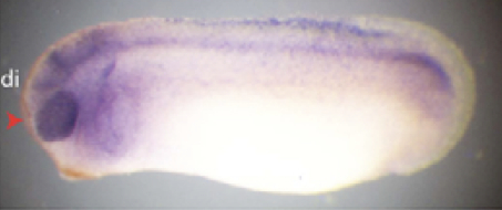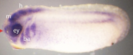 foxg1 (forkhead box G1 ) gene expression in Xenopus laevis embryo, assayed via in situ hybridization, NF stage 28, anterior left, lateral view, dorsal up.