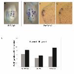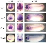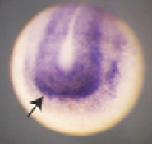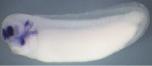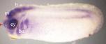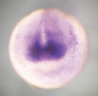 foxg1 (forkhead box G1) gene expression in Xenopus laevis embryo, assayed via in situ hybridization, NF stage 16, anterior view, dorsal up.