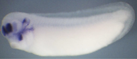 tle5 (TLE family member 5, transcriptional modulator) gene expression in Xenopus laevis embryo, assayed via in situ hybridization, NF stage 27/28, lateral view, dorsal up, anterior left.