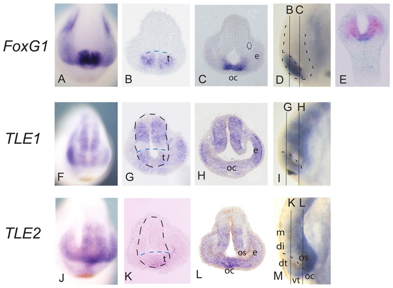 Fig. 4. Region-specific expression of TLE1 and TLE2 in the developing telencephalon. (A-M) Whole-mount in situ hybridisation for FoxG1 (A-E), TLE1 (F-I) and TLE2 (E,J-M) in X. tropicalis. All images except E (st. 28) represent st. 22 embryos. (B,C,G,H,K,L) Transverse sections (20 μm) of whole-mount stained embryos. The neural tissue is outlined by black dashed lines, and the dorsal border of the telencephalon is indicated by blue dashed lines. The plane of the sections is shown in cleared embryos (D,I,M, anterior to the left, eyes removed). Black dashed lines in G and K indicate the telencephalon and the whole brain tissue. (E) A double in situ stained for FoxG1 (purple) and TLE2 (blue) at st. 28; the plane of section is similar to C. di, diencephalon; dt, dorsal telencephalon; e, eye; oc, optic chiasm; os, optic stalk; m, mesencephalon; t, telencephalon; vt, ventral telencephalon. Annotation based on Bachy et al. (Bachy et al., 2002).