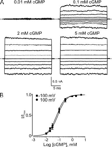 Figure 1. cGMP activation of CNGA1 channels. (A) Macroscopic current traces recorded in symmetric 130 mM Na+ from an inside-out patch containing CNGA1 channels in the presence of the indicated concentrations of intracellular cGMP. Currents were elicited by stepping from the 0-mV holding potential to voltages between −200 and 200 mV in 50-mV increments. Currents in the absence of cGMP were used as templates for subsequent offline background current corrections. Dotted lines indicate 0 current levels. (B) Fraction of maximal current (I/Imax; mean ± SEM; n = 3–7) plotted against cGMP concentration for −100 mV (squares) and 100 mV (circles). Solid curves are Hill equation fits yielding EC50 = 79 ± 1 µM and h = 1.37 ± 0.03 at −100 mV, and EC50 = 64 ± 2 µM and h = 1.39 ± 0.05 at 100 mV.
