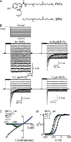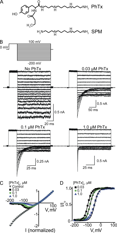 Figure 2. Voltage-dependent CNGA1 block by extracellular PhTx. (A) Structures of PhTx and spermine (SPM). (B) Macroscopic current traces recorded from inside-out patches containing CNGA1 channels in the presence of the indicated concentrations of extracellular PhTx (in the pipette solution). Currents were activated with 2 mM of intracellular cGMP and elicited with the voltage protocol shown. Dotted lines indicate 0 current levels. (C) Mean I-V curves (mean ± SEM; n = 3–11) determined at the end of the test pulses in the absence or presence of three concentrations of extracellular PhTx. (D) Fraction of current not blocked (mean ± SEM; n = 4–6) by extracellular PhTx is plotted against membrane voltage. Curves are fits of a Boltzmann function (Eq. 1) to the three datasets simultaneously with parameters: appKd (0 mV) = 2.71 ± 0.20 × 10−5 M and Z = 1.76 ± 0.02.