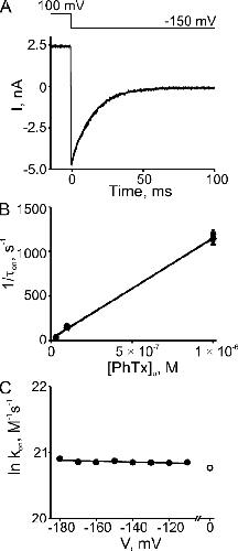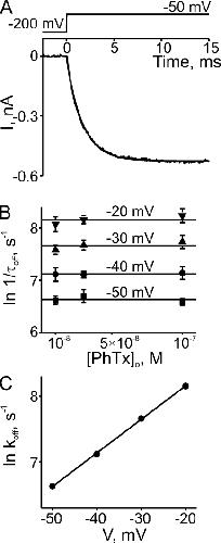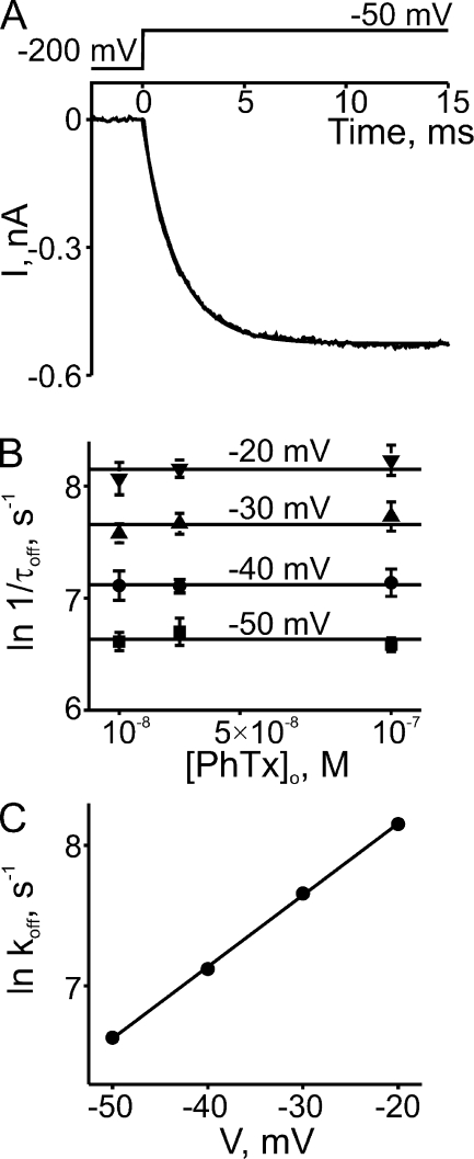 Figure 4. Kinetics of depolarization-induced recovery from CNGA1 block by extracellular PhTx. (A) Current transient elicited by stepping the membrane voltage from −200 to −50 mV in the presence of 0.1 µM of extracellular PhTx. The superimposed curve is a single-exponential fit. (B) Natural logarithm of the reciprocal of the time constant (mean ± SEM; n = 4–6) for channel unblock (1/τoff, an estimate of the apparent off-rate constant koff) at four voltages, obtained from fits as shown in A, is plotted against the concentration of extracellular PhTx. Lines through the data represent averages over the three concentrations tested at each voltage. (C) Natural logarithm of koff from B is plotted against membrane voltage. The plot is fitted with the equation ln koff = ln koff (0 mV) + zoffVF/RT, yielding koff (0 mV) = 9.65 ± 0.35 × 103 s−1 and zoff = 1.31 ± 0.02.