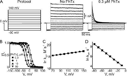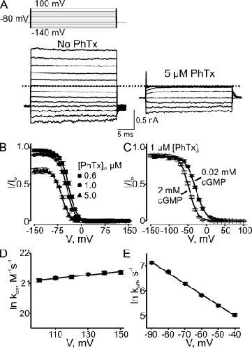 Figure 5. Voltage-dependent block by intracellular PhTx. (A) Macroscopic current traces recorded from an inside-out patch containing CNGA1 channels in the absence or presence of 0.3 µM of intracellular PhTx. Currents were activated with 2 mM of intracellular cGMP and elicited with the voltage protocol shown. Dotted line indicates 0 current level. (B) Fraction of current not blocked (mean ± SEM; n = 5–10) by intracellular PhTx is plotted against membrane voltage. Curves are fits of a single Boltzmann function to the four datasets simultaneously with parameters: appKd (0 mV) = 8.58 ± 0.38 × 10−7 M and Z = 2.67 ± 0.04. (C) Kinetics of depolarization-induced CNGA1 block by intracellular PhTx. Natural logarithm of second-order rate constant kon, determined as in Fig. 3, at three concentrations of intracellular PhTx (0.3, 1, and 10 µM; n = 8) is plotted against membrane voltage. The plot is fitted with the equation ln kon = ln kon (0 mV) + zonVF/RT, yielding kon (0 mV) = 4.23 ± 0.34 × 107 M−1s−1 and zon = 0.23 ± 0.01. (D) Kinetics of hyperpolarization-induced recovery from CNGA1 block by intracellular PhTx. Natural logarithm of koff, determined as in Fig. 4, at three concentrations of intracellular PhTx (0.1, 0.3, and 1 µM; n = 5) is plotted against membrane voltage. The plot is fitted with the equation ln koff = ln koff (0 mV) − zoffVF/RT, yielding koff (0 mV) = 33 ± 1 s−1 and zoff = 1.60 ± 0.01.