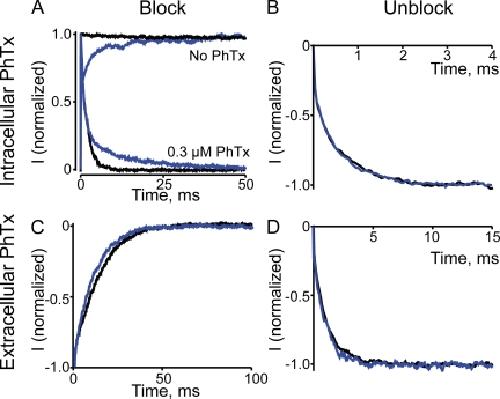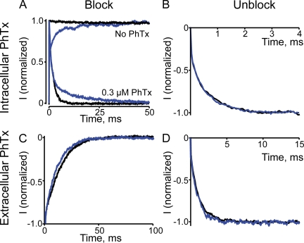Figure 7. Voltage dependence of intracellular and extracellular PhTx block at saturating and subsaturating cGMP concentrations. (A) Normalized current transients elicited by stepping membrane voltage from −80 to 120 mV in the absence (top) or presence (bottom) of 0.3 µM of intracellular PhTx and of 2 mM (black) or 20 µM cGMP (blue; average of 20 consecutive traces from the same patch). The current in 20 µM cGMP is sevenfold smaller than that in 2 mM. (B) Normalized current transients, elicited by stepping membrane voltage from 120 to −80 mV, in the presence of 0.3 µM of intracellular PhTx and of 2 mM (black; average of five consecutive traces from the same patch) or 20 µM cGMP (blue; average of 10 consecutive traces from the same patch). (C) Normalized current transients elicited by stepping membrane voltage from 100 to −150 mV in the presence of 0.1 µM of extracellular PhTx and of 2 mM (black) or 20 µM cGMP (blue; average of 20 consecutive traces from the same patch). (D) Normalized current transients elicited by stepping membrane voltage from −200 to −50 mV in the presence of 0.1 µM of intracellular PhTx and of 2 mM (black) or 20 µM cGMP (blue; average of 20 consecutive traces from the same patch).