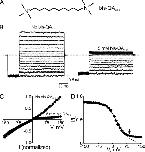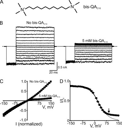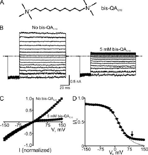 Figure 8. Voltage-dependent block by intracellular bis-QAC10. (A) Chemical structure of bis-QAC10. (B) Macroscopic current traces recorded from an inside-out patch containing CNGA1 channels in the absence or presence of 5 mM of intracellular bis-QAC10. Currents were elicited by first stepping the voltage from the 0-mV holding potential to â150 mV, and then testing voltages between â150 and 150 mV in 10-mV increments before returning to the holding potential. For clarity, only traces every 20 mV are shown. Dotted line indicates 0 current level. (C) I-V curves (mean ± SEM; n = 5) determined at the end of the test pulses in the absence or presence of 5 mM bis-QAC10. (D) Fraction of current not blocked (mean ± SEM; n = 5) by 5 mM bis-QAC10 is plotted against membrane voltage. The solid curve is a fit of Eq. 10 to the data from â150 to 90 mV (arrow) with KB1 = 3.17 ± 0.05 à 10â2 M, KB2 = 2.23 ± 0.14 à 10â2, KB2-Na = 2.67 ± 0.09 Mâ1, and Z = 1.11 ± 0.02. Dotted curve is a fit to the data from â150 to 90 mV (arrow) of a Boltzmann function (similar to Eq. 1, except for a nonunity asymptote at hyperpolarized potentials) with parameters appKd = 1.23 ± 0.08 à 10â2 M and Z = 0.83 ± 0.03.