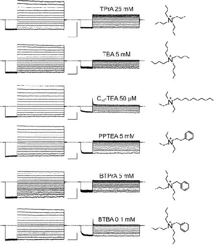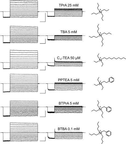 Figure 9. CNGA1 block by six intracellular QA compounds. Macroscopic currents recorded in the absence (left column) or presence (middle column) of the indicated blocker concentration. Bars, 1 nA and 20 ms. Chemical structures of the blockers are shown on the right.