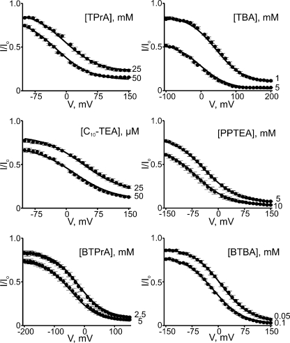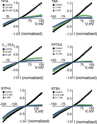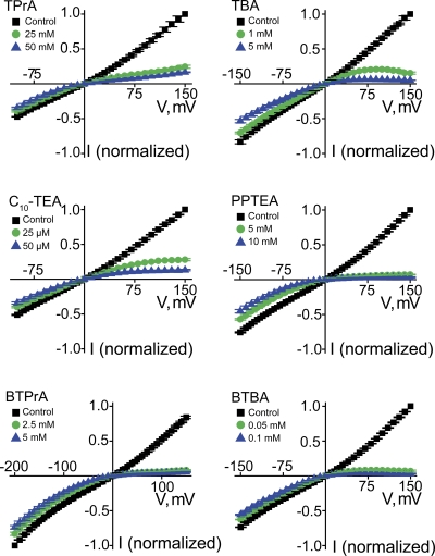 Figure 10. Intracellular QA blockers render current–voltage relations of CNGA1 channels inwardly rectifying. Mean I-V curves (mean ± SEM; n = 3–8) in the absence (control) or presence of six QAs, each at two concentrations.