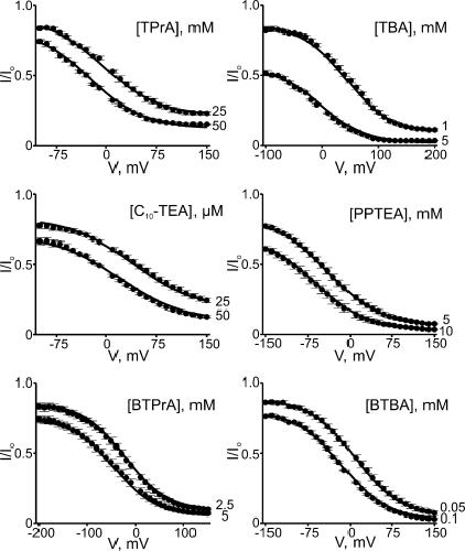 Figure 11. Voltage-dependent block by six intracellular QAs. Fraction of current not blocked (mean ± SEM; n = 3–8) plotted against voltage for six QAs, each at two concentrations. Curves were obtained by fitting Eq. 10 to the two datasets in each plot simultaneously. The resulting parameters are listed in Table I.