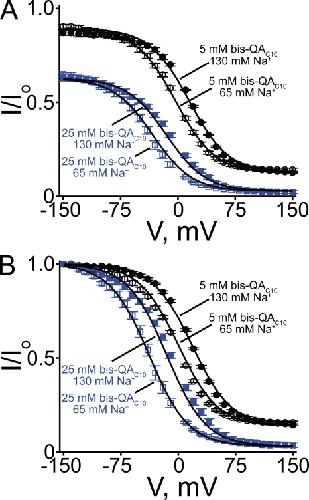 Figure 12. CNGA1 block by intracellular bis-QAC10 in 65 and 130 mM of symmetrical Na+. (A) The fraction of current not blocked (mean ± SEM; n = 4â7) in the presence of 65 mM (open symbols) and 130 mM (filled symbols) of symmetrical Na+ by 5 mM (black symbols) and 25 mM (blue symbols) bis-QAC10 is plotted against voltage. Curves were obtained by fitting Eq. 10 to the four datasets simultaneously. The resulting parameters are listed in Table I. (B) Data in A scaled to unity at â150 mV. Curves were obtained by fitting Eq. 7 to the four datasets simultaneously. The best-fit parameters were: KB = 7.97 ± 0.31 à 10â4 M, KB-Na = 8.97 ± 0.16 à 10â2, and Z = 1.00 ± 0.01.