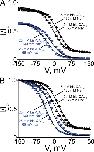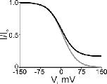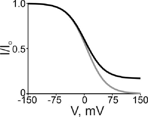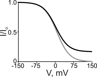 Figure 13. Simulated curves of a Boltzmann function (gray curve) and of the three-state ion displacement model (black curve), both for the case of a positively charged intracellular blocker. The Boltzmann curve was generated from Eq. 1 with [B] = 5 mM, appKd = 6.5 mM, and Z = 1. The black curve was generated from Eq. 7 with [B] = 5 mM, [Na+] = 130 mM, KB = 1 mM, KB-Na = 0.05, and Z = 1.