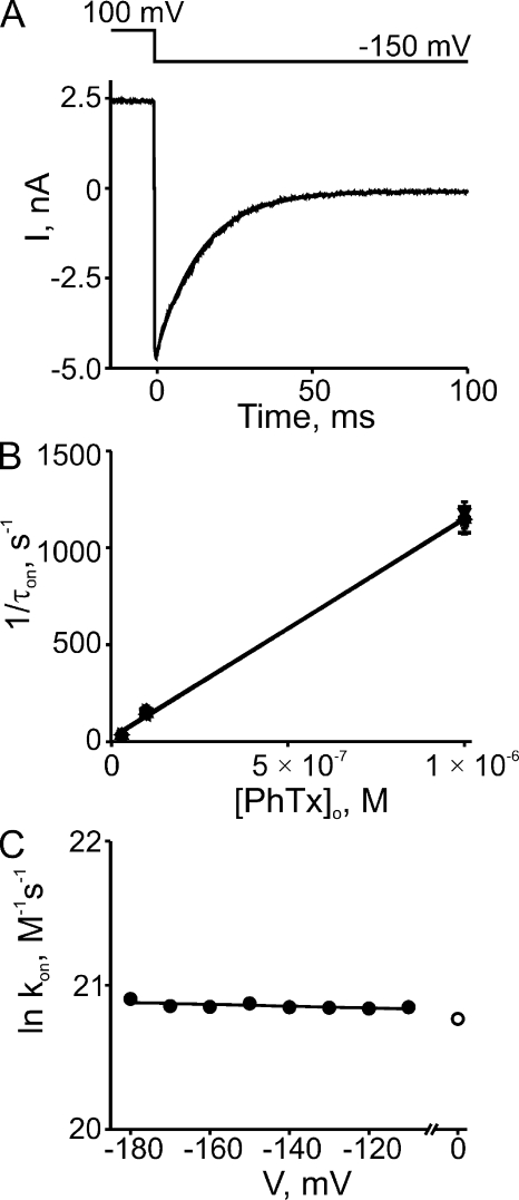 Figure 3. Kinetics of hyperpolarization-induced CNGA1 block by extracellular PhTx. (A) Current transient elicited by stepping membrane voltage from 100 to −150 mV in the continued presence of 0.1 µM of extracellular PhTx. The superimposed curve is a single-exponential fit. (B) Reciprocal of the time constant (mean ± SEM; n = 4–6) for channel block (1/τon), obtained from fits as shown in A, is plotted against the extracellular concentration of PhTx for eight voltages. The (unresolved) lines through the data are linear fits whose slope represents the apparent second-order rate constant (kon) for blocker binding. (C) Natural logarithm of kon from B is plotted against membrane voltage. The plot is fitted with the equation ln kon = ln kon (0 mV) − zonVF/RT, yielding kon (0 mV) = 1.04 ± 0.06 × 109 M−1s−1 (open circle) and zon = 0.01 ± 0.01.