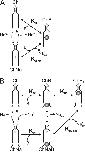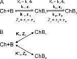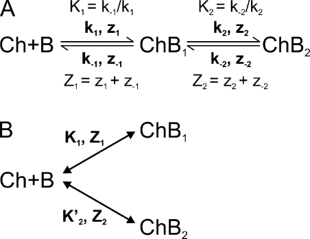 Figure 14. Models for multistate channel block. Binding of a blocker denoted as “B” to a channel (Ch) produces two blocked states (ChB1 and ChB2) in sequential (A) or parallel (B) steps. Kx are equilibrium constants with effective valences Zx; kx are rate constants and zx their effective valences.