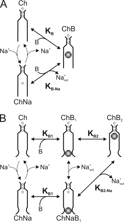 Figure 15. Ion displacement models for channel block. (A) Minimal three-state ion displacement model for voltage-dependent block. The transmembrane voltage drops exclusively across the narrow part of the pore that can only be occupied by permeant ions. The number of permeant ions in the selectivity filter is inconsequential to the model, and the number of ions in the inner pore is set at the minimum of one. The channel can exist in two nonblocked states with (ChNa) or without (Ch) a permeant Na+ ion at the inner pore site (internal to the narrow selectivity filter) and one blocked state (ChB). The upper blocking transition is voltage independent as the blocker binds in the empty inner pore with equilibrium constant KB, whereas the lower transition (equilibrium constant KB-Na) is voltage dependent as the blocker displaces the Na+ ion. (B) Ion displacement model with sequential blocking steps. The two leftmost nonblocked states are equivalent to those of the minimal three-state model in A, with (ChNa) and without (Ch) a Na+ ion in the inner pore. The blocker may bind (common equilibrium constant KB1) to the shallow site of either nonblocked form. It then binds at the deep binding site (ChB2). The transition that involves Na+ displacement is characterized by KB2-Na and is voltage dependent, whereas the one that does not involve Na+ displacement is characterized by KB2 and is voltage independent.