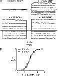 Figure 6. Voltage dependence of intracellular PhTx block under low Na+ conditions. (A) Macroscopic current traces recorded in an inside-out patch containing CNGA1 channels in the absence or presence of 5 µM of intracellular PhTx in symmetrical 30 mM Na+. Currents were activated with 2 mM of intracellular cGMP and elicited with the voltage protocol shown. Dotted line indicates 0 current level. (B) Fraction of current not blocked (mean ± SEM; n = 4–8) by the indicated concentrations of intracellular PhTx is plotted against membrane voltage. Curves are fits of Eq. 3 to the three datasets simultaneously with Z1 fixed at 0. The best-fit parameters were: K1 = 1.04 ± 0.03 × 10−5 M, K2 = 2.03 ± 0.14 × 10−3, and Z2 = 2.08 ± 0.04. (C) Fraction of current not blocked (mean ± SEM; n = 8) by 1 µM of intracellular PhTx in the presence of 0.02 mM (filled circles) or 2 mM (open circles; taken from B) cGMP is plotted against membrane voltage. Curves are fits of Eq. 3 to both datasets simultaneously, with Z1 set to 0 and K1 common to both cGMP curves. The best-fit parameters were: K1 = 7.65 ± 0.22 × 10−6 M for both cGMP concentrations; K2 = 1.29 ± 0.08 × 10−2 and Z2 = 1.92 ± 0.05 for 0.02 mM cGMP; and K2 = 1.72 ± 0.18 × 10−3 and Z2 = 2.29 ± 0.06 for 2 mM cGMP. (D) Kinetics of depolarization-induced CNGA1 block by intracellular PhTx in 30 mM Na+. Natural logarithm of kon, determined as in Fig. 3, at four concentrations (0.03, 0.1, 0.3, and 1 µM; n = 6) of intracellular PhTx is plotted against membrane voltage. The plot is fitted with the equation ln kon = ln kon (0 mV) + zonVF/RT, yielding kon (0 mV) = 8.42 ± 0.68 × 108 M−1s−1 and zon = 0.14 ± 0.01. (E) Kinetics of hyperpolarization-induced recovery from CNGA1 block by intracellular PhTx in 30 mM Na+. Natural logarithm of koff, determined as in Fig. 4, at four concentrations (0.1, 0.3, 0.6, and 1 µM; n = 6) of intracellular PhTx is plotted against membrane voltage. The plot is fitted with the equation ln koff = ln koff (0 mV) − zoffVF/RT, yielding koff (0 mV) = 27 ± 2 s−1 and zoff = 1.10 ± 0.02.