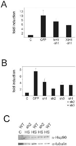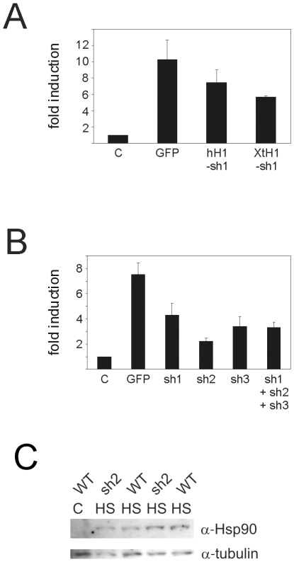 Figure 4. The effect of XHSF1 shRNAs on the HSR.(A,B) Reporter gene analysis of (A) the effect of HSF1 shRNAs expressed from the human or Xenopus H1 promoter, and (B) the effect of different shRNAs expressed from the Xenopus H1 promoter, on the HSR. A6 cells were transfected with mixtures of an Hsp70-luciferase reporter, a CMV-β-galactosidase reporter and the indicated plasmids. Relative luciferase activities and -fold induction were determined as described in the legend to fig. 2C. The results are the average of three independent transfections (standard deviations are indicated by error bars). (B) Western blot analysis of Hsp90 levels in tadpoles carrying the indicated transgenes. Lysates were made from whole tadpoles before heat shock (C) or after a 1 h heat shock at 33°C followed by 6 h recovery at room temperature (HS). The lysates were subjected to SDS-PAGE and western blot analysis using anti-Hsp90 and anti-tubulin antibodies.