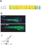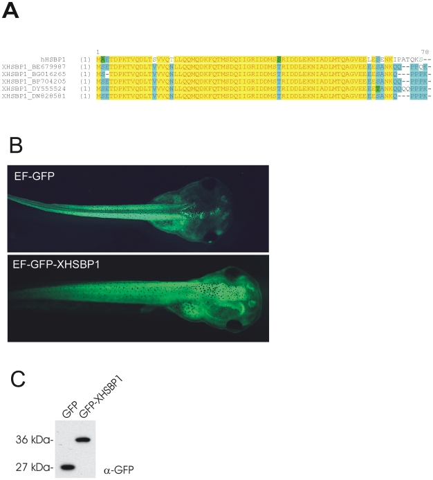 Figure 1. Ubiquitous transgene-driven expression of XHSBP1 in Xenopus tadpoles.(A) ClustalW alignment of human HSBP1 (top) and HSBP1 sequences deduced from five different Xenopus laevis ESTs. The central coiled coil region is highly conserved between man and Xenopus. (B) Fluorescence microscope analysis of tadpoles carrying the indicated transgenes. Tadpoles with ubiquitous, high level expression of GFP-HSBP1 look normal. (C) Western blot analysis of lysates from whole tadpoles carrying the indicated transgenes. Proteins were separated by SDS-PAGE and analyzed with an anti-GFP antibody.