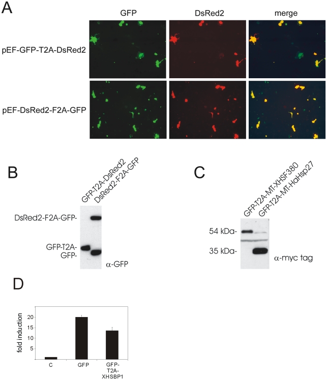 Figure 3. The effect of exogenous expression of XHSBP1 on the HSR.(A) Fluorescence microscope analysis of reporter gene expression from bicistronic plasmids. A6 cells were transfected with the indicated dual reporter gene plasmids based on viral 2A peptides. At 24 h after transfection, GFP and DsRed expression was determined by fluorescence microscope analysis. (B) Western blot analysis of gene expression from bicistronic plasmids. A6 cells were transfected with the indicated 2A peptide-based plasmids. At 24 h after transfection, cell lysates were made and subjected to SDS-PAGE and western blot analysis using anti-GFP antibodies. (C) Western blot analysis of gene expression from bicistronic plasmids. A6 cells were transfected with the indicated 2A peptide-based plasmids. At 24 h after transfection, cell lysates were made and subjected to SDS-PAGE and western blot analysis using anti-GFP and anti-myc tag antibodies. (D) Reporter gene analysis of the effect of native XHSBP1 on the HSR. A6 cells were transfected with mixtures of an Hsp70-luciferase reporter, a CMV-β-galactosidase reporter and the indicated plasmids. Relative luciferase activities and -fold induction were determined as described in the legend to fig. 2C. The results are the average of three independent transfections (standard deviations are indicated by error bars).
