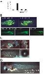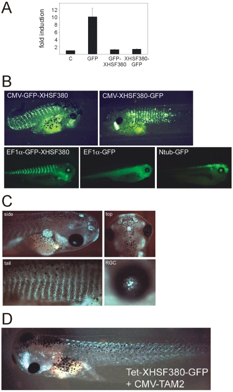 Figure 5. Transgene-driven expression of dominant-negative HSF1 in Xenopus larvae.(A) Reporter gene analysis of the effect of GFP-XHSF380 or XHSF380-GFP on the HSR. A6 cells were transfected with mixtures of an Hsp70-luciferase reporter, a CMV-β-galactosidase reporter and the indicated plasmids. Relative luciferase activities and -fold induction were determined as described in the legend to fig. 2C. The results are the average of three independent transfections (standard deviations are indicated by error bars). (B) Fluorescence microscope analysis of GFP-tagged XHSF380 constitutively expressed from either the CMV or the EF1α promoter in transgenic Xenopus larvae. Larvae with high constitutive expression of GFP-tagged XHSF380 develop poorly and never reach the feeding tadpole stage. Also shown are transgenic Xenopus larvae showing strong neuronal expression of GFP when driven by the EF1α or the Ntub promoter. (C) Fluorescence microscope analysis of transgenic Xenopus larvae expressing full length GFP-tagged XHSF1 from the CMV promoter. Fluorescence is pronounced in kidney, epiphysis, nasal epithelium, olfactory lobes, gills, retinal ganglion cell layer (RGC) and tailmuscle nuclei. (D) Fluorescence microscope analysis of doxycycline-induced expression of GFP-tagged XHSF380 expressed in transgenic Xenopus larvae. A mixture of TetO-XHSF380-GFP and CS2+rtTA2A-M2 (CMV-TAM2) cassettes was used to generate transgenic Xenopus larvae. The larvae were allowed to develop in the absence of doxycycline until the feeding tadpole stage. GFP-negative larvae were exposed to doxycycline for 20 h and then monitored for GFP fluorescence.